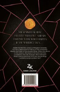 Mable returns to Kingston University, determined to hold on to her scholarship despite the threat of the powerful Kings who rule the campus. Expecting the worst, a mysterious new ally emerges, and to her surprise, the Kings suddenly seem very willing to protect her. Who is Romeo? What is Vance planning? And why are the rules changing again? In this dangerous new round of intrigue, power, and seduction, Mable will learn that even the most beautiful wings can be snapped...